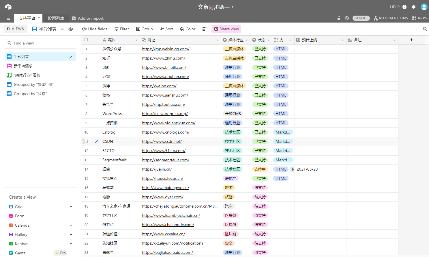 这个时候只能寻求更简便的产品了,比如说先前有调研过的Airtable。相对而言就简单很多了,以定好的数据表为基础,可以衍生到表单提交 ,按某个字段聚合的(看板、图表)视图!